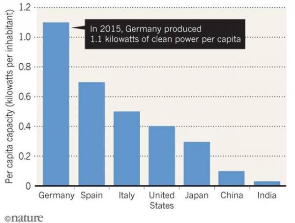 纵坐标:人均装机容量(千瓦/人);横坐标:德国、西班牙、意大利、美国、日本、中国、印度,图中:2015年,德国人均清洁电力装机量达到1.1千瓦