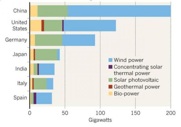 纵坐标:中国、美国、德国、日本、印度、意大利、西班牙,横坐标:吉瓦图例:风电、集中式太阳能发电、光伏、地热发电、生物质发电
