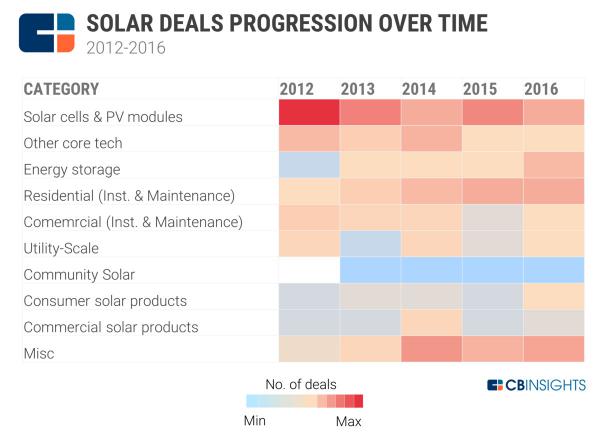 下面的热力图展示了2012至2016年间太阳能产业各个分领域的投资趋势。