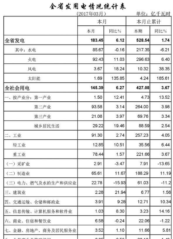 3月份,全社会用电145.39亿千瓦时,增长6.27%,其中工业用电91.30亿千瓦时,增长2.74%。
