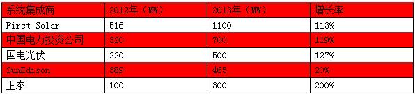 在金太阳工程等补贴政策以及对欧出口组件下滑的推动下,中国政府正在为本土系统集成商创造机会。IHS预测,在2013年,中国电力投资公司将完成700MW的安装量,年增率达119%,使其在全球系统集成商排名中从去年的第四位上升到第二位。