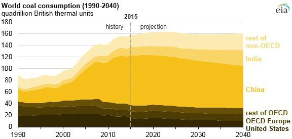 当前,煤炭正在被淘汰,继续被天然气,可再生能源和核能替代。煤炭占世界能源消费总量的比例预计将从2015年的27%下降到2040年的22%。在这个阶段,中国依然是世界最大的煤炭消耗国。预计到2040年,中国煤炭消费量将每年下降0.6%。