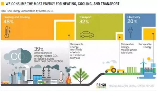 根据REN21的2018年“全球可再生能源现状报告”(GSR),2017年可再生能源发电占到全球发电量净增加值的70%。这是现代历史上可再生能源发电量增长最大的一年。然而占全球终端能源需求量80%的供热、制冷和交通领域对于可再生能源的使用却远远落后于电力行业。