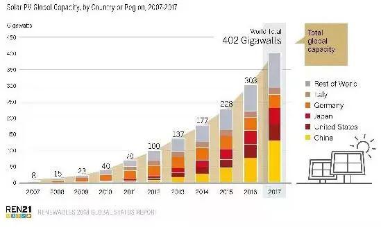 太阳能光伏新增装机容量达到创纪录的水平:与2016年相比,太阳能光伏发电装机总量增加了29%,达到98GW。光伏新增装机容量大于燃煤、天然气和核电净增装机容量之和。此外,全球风电新增装机容量52GW,也对可再生能源总装机容量起到了扩充作用。