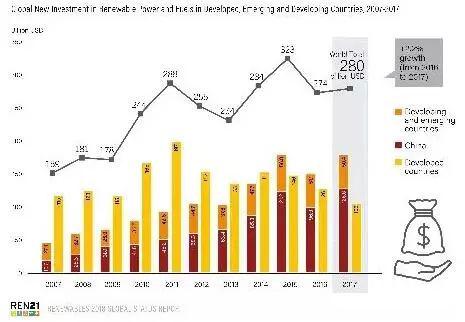 目前全球对化石燃料发电仍提供大量的补贴,但对新增可再生能源发电的投资已超过对新增化石燃料和核能发电投资总和的两倍以上。由于成本竞争力的提高,2017年可再生能源投资占电力行业总投资的比例超过三分之二,同时可再生能源在电力行业的份额仍将会继续上升。