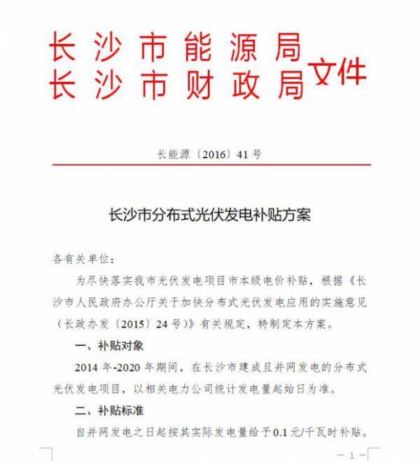 近日,长沙市发改委发布《关于开展2018下半年度长沙市分布式光伏发电项目补贴申报的通知》,通知明确,2014年-2020年期间,在长沙市建成且并网发电的分布式光伏发电项目,以相关电力公司统计发电量起始日为准,自并网发电之日起按其实际发电量给予0.1元/千瓦时补贴。原文如下: