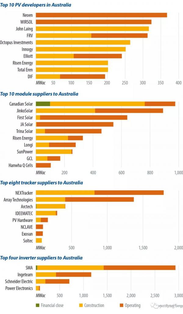 澳大利亚快速增长的光伏市场格局,在很大程度上受到该国大型项目开发趋势的影响。能够确保获得大量规模超200兆瓦项目供应协议的,基本也就确保了其在排行榜上会有一席之地。但随着新项目的不断增加,这一排行榜也在不断变动。