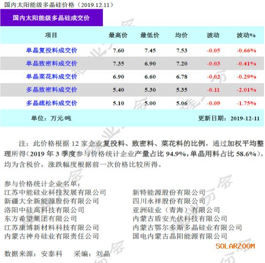 本周多晶硅市场价格继续创历史新低,单晶致密料均价下滑到7.20万元/吨,同比下跌11.1%,多晶疏松料均价继续下跌至5.15万元/吨,同比跌幅达到32.1%,但本周周环比跌幅收窄,且跌速呈放缓迹象。单晶用料价格本周继续小幅下滑,主要是由于硅片企业受非硅成本上涨压力,转向压缩供应相对充足的硅料成本,而多晶硅企业临近年底为保证合理库存被迫小幅降价成交。铸锭用料本周成交价继续创新低,多晶疏松料成交价在5.1万元/吨左右,个别少量订单已跌破5万元/吨,完全不能覆盖现金成本,近期铸锭硅片减产降价仍是导致多晶硅价格下滑的主要原因,但目前价格已几乎到达各企业承受极限,因此本周跌幅有收窄迹象。