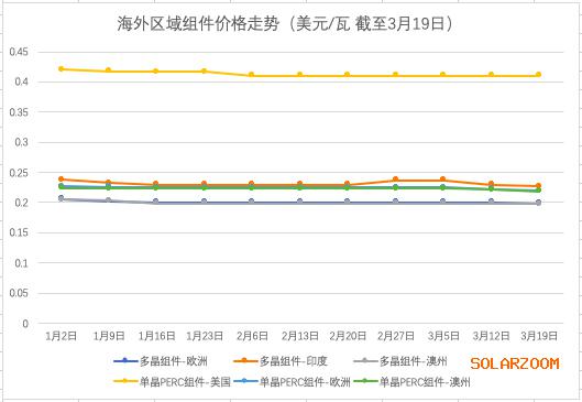 就海外区域组件价格而言,基本平稳,近期价格微跌,据PVInfoLink分析,主要受汇率变动影响。虽然目前海外订单暂未出现明显变化,不过随着欧、美等装机大国疫情越发严重,下游项目需求或向后推延,组件需求不确定性增加。