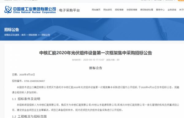 2020年4月10日,中核汇能发布2020年光伏组件设备第一次框架集中采购招标公告。本次招标为中核汇能有限公司/中核山东能源有限公司或其他与中核汇能有限公司一体化管理的机构及所属项目公司2020年12月31日前项目的预计装机总量(包括自主投资建设项目和拟收购项目),装机总量预计为3GW。