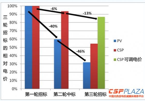 三轮招标的平均电价呈直线下降趋势,光伏发电从首轮招标的22.4欧分/KWh降至第三轮的7.17欧分/KWh,光热发电也从21.86欧分/KWh降至11.88欧分/KWh&18.95欧分/KWh,第三轮招标将光热发电的电价分为两个部分,即日常电价和可调电价,可调电价即在用电高峰期发电的电价,为18.95欧分。根据不同的光热电站的储热容量设计,一个光热电站以可调电价出售电力的电量比例可以占到35%到65%。即便全部以可调电价标准计算,与第二轮招标相比,第三轮招标的光热电站中标电价仍然要下降13%。