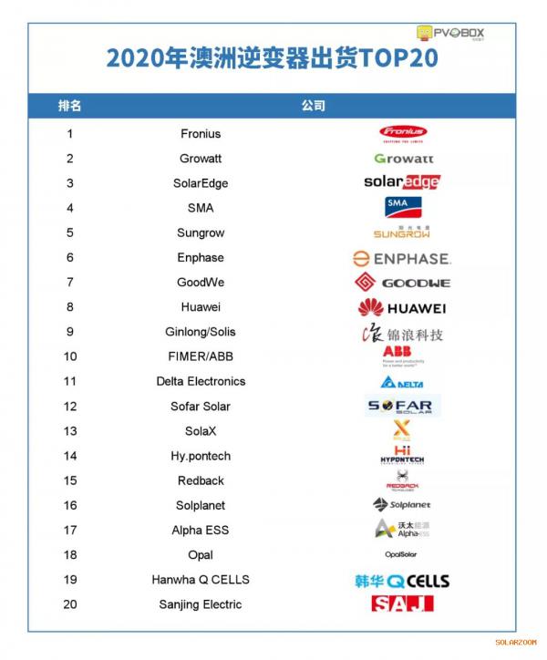 2020年澳大利亚光伏装机超过5GW,其中户用超过了3GW,2020年澳大利亚光伏发电可满足全澳20%的用电需求,同时澳大利亚也是我国重要的光伏出口市场,多家国内逆变器企业在澳洲开疆扩土,在2020年斩获了不少订单,如今,2020年澳大利亚逆变器TOP20出炉,让我们一起来看一下吧。