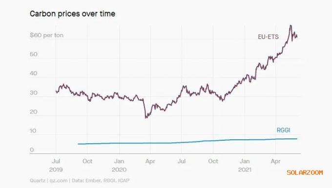 除了电力供给突然的变化、天然气原料价格上涨。欧洲碳价的飞涨也是本轮刺激欧洲电价的主要原因之一。过去十年左右的时间里,欧洲碳价基本在50欧元以内。但是今年碳价一路上扬,甚至突破了60欧元。