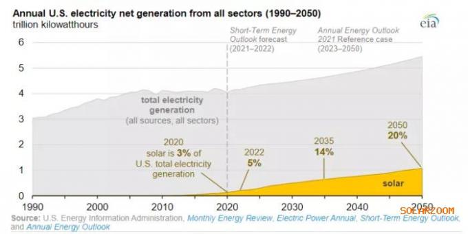 根据美国能源信息署(EIA)日前发布的)电力年度报告,2020年的光伏发电量已占美国总发电量的3%。EIA在其短期能源展望中预测,2021年光伏发电量将占4%,而2022年的光伏发电量将占5%。在《2021年能源展望》(AEO2021)报告参考案例中,假设现行法律法规没有变化,EIA预计,2035年光伏发电将占美国总发电量的14%,2050年将占20%。