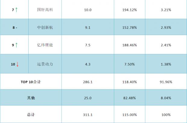 2021年动力电池装机量排名前十的企业分别是宁德时代99.6GWh、LG新能源61.3GWh、松下36.3GWh、比亚迪27.9GWh、SKOn16.8GWh、三星SDI 13.3GWh、国轩高科10.0GWh、中创新航9.1GWh、亿纬锂能7.5GWh、远景动力4.3GWh;前10家企业动力电池总装机量为286.1GWh,同比增长118.40%;前10家企业总装机量占比91.96%,相比去年提高1.43个百分点。