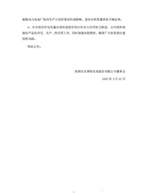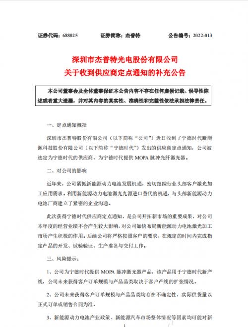 3月22日,杰普特发布公告称,公司近日收到了宁德时代发出的供应商定点通知,公司被选定为宁德时代的供应商,为宁德时代提供MOPA脉冲光纤激光器,应用于动力电池电芯制造的极片切割工序。