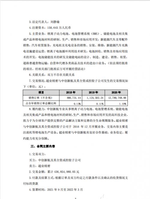 公告显示,超业精密主营锂电池中后段及整线设备,与中创新航及其全资或控股子公司于2016年12月开展业务,交易内容主要是注液机等锂电池生产设备。