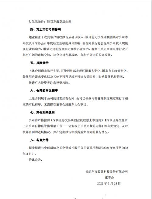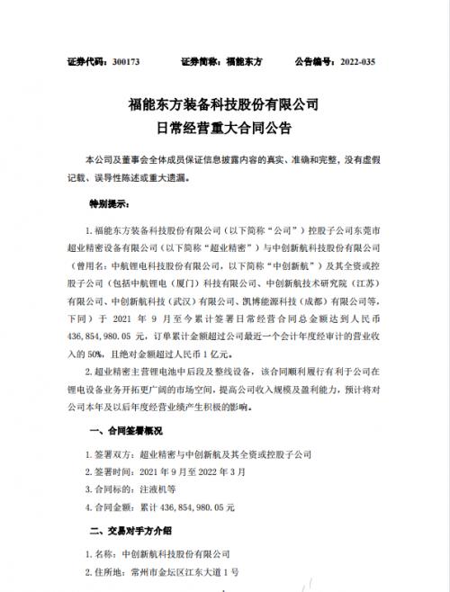 3月25日,福能东方(300173)发布公告,控股子公司东莞市超业精密设备有限公司与中创新航及其全资或控股子公司于2021年9月至今累计签署日常经营合同总金额达到人民币4.37亿元,超过公司最近一个会计年度经审计的营业收入的50%。