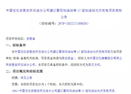 2022年9月28日,中国石化安徽安庆石油分公司望江雷阳加油站等17座加油站光伏发电项目竞标公告发布: