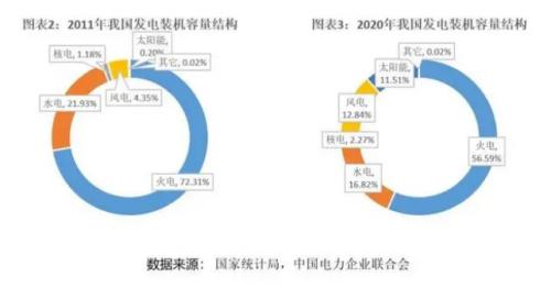 随着光伏、风电等绿色发电形式崛起,我国以煤电为主的结构逐渐发生剧变。近年来,风电及太阳能发电等一次电力及能源,表现亮眼,2011年,火电及水电是我国发电装机容量的主力,太阳能发电仅占比0.2%。2020年,随着我国发电结构更加丰富,太阳能装机量占比从0.2%提升至11.51%,风电装机量占比从4.35%提升至12.84%。从2020年到2020年,风电及太阳能发电消费占比,从7.3%提升至15.9%,2011年后增速明显加快。
