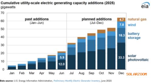 EIA称,这一数字将打破2002年创下的纪录,当时新增装机容量为58吉瓦,其中57吉瓦来自天然气。而2025年的纪录将由清洁能源主导,太阳能预计贡献33.3吉瓦,其次是18.3吉瓦电池储能、7.8吉瓦风电和4.7吉瓦天然气。