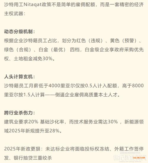 沙特政府对本地化率有明确要求,如“尼塔卡特”(Nitaqat)即沙特政府实施的劳动力本地化政策,通过配额制度要求私营部门公司雇佣一定比例的沙特国民。