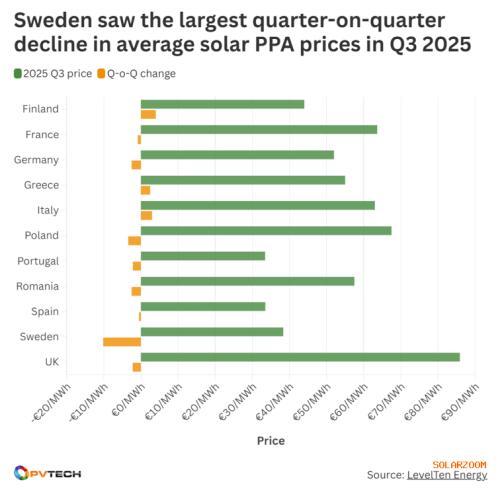 这一数据是根据分析机构LevelTen Energy的最新报告得出的。数据反映出今年第二季度到第三季度之间3%的降幅。与2024年第三季度相比,欧洲太阳能PPA均价目前已下降19.4%。