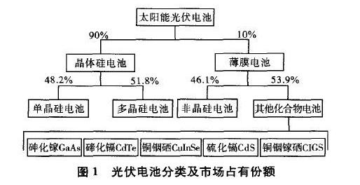 太阳能电池按其所用原料不同可以分为晶体硅太阳能电池、薄膜电池、染料敏化电池和有机太阳能电池等几类。其中染料敏化太阳能电池和有机太阳能电池尚处于实验研发阶段,市场占有率极低。图1显示了欧洲光伏产业协会(EPIA)列举的太阳能光伏电池分类及市场占有份额。从图1中可以看出,晶体硅电池仍是光伏产业的主流产品,市场占有份额约9O%。薄膜电池领域中,化合物薄膜电池市场占有份额在1/2以上,高于非晶硅薄膜电池。