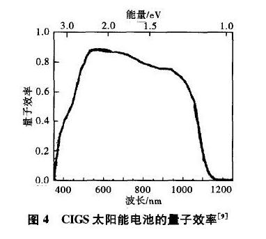 通过改变CIGS吸收层中Ga的含量,可以实现产物禁带宽度在1.O4~1.68eV之间的可控性调节。鉴于吸收太阳能理想的禁带宽度为1.45~1.5eV,通过带隙优化可使CIGS最大限度地吸收太阳能。图4显示了高质量CIGS太阳能电池量子效率图。量子效率是指针对某一波长的入射光收集到的光电流与照射到薄膜表面的该波长的光子数之比。明显地,量子效率越高,光电转换效率越大。从图4中可以看出,CIGS薄膜电池的光谱响应范围较宽(350~1100rim),约占太阳能辐射光谱能量的79%,光谱利用率高。