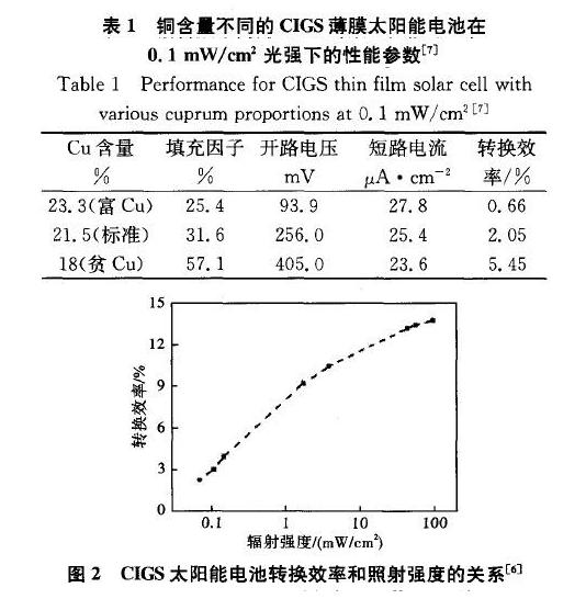 CIGS薄膜太阳能电池不仅在阳光直射下具有较高的转化效率,其弱光特性也是其他电池所无法比拟的。研究表明,在太阳辐射强度不太理想的地区,CIGS薄膜电池一天或一段时间内的累计发电量要远高于其他类电池。图2为照射光辐射强度对玻璃衬底CIGS薄膜电池转换效率的影响。标准光强照射条件下光电转换效率为14%左右,光强降到5mW/cm时,仍有1O%左右的光电转换效率,当光强进一步降到0.1mW/cm时,效率相应降到3%左右。Virtuan等研究了铜含量不同的CIGS薄膜电池在低辐射强度下的性能参数情况,结果如表1所示。从表1可以看出,Cu含量的适度降低可以极大提高电池的弱光特性。贫铜含量下,电池转换效率大约为标准铜含量时的2.6倍,填充因子和开路电压也有显著提高。这表明CIGS薄膜电池的弱光性能可以通过铜含量的适度偏离得到极大改善。