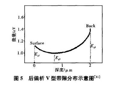 另外,在沉积CIGS吸收层时可制成具有Ga含量偏析的层状结构,使禁带宽度呈梯度或V型分布。图5显示了后偏析V型带隙分布示意图。如图5所示,薄膜内部存在带隙极小点(1.0~1.1eV),两侧带隙较宽。这样高能量光子在宽带隙薄膜表面处被吸收,能量较小的红外光子透过薄膜表面后在带隙极小处被吸收,从而最大限度地提高光子的吸收效率。另外,后偏析V型带隙分布由于在靠近Mo背电极附近的吸收层形成势垒,减少了光生载流子在Mo背电极的复合,从而可获得更多的电流输出。