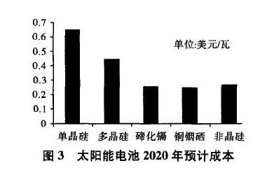 目前CIGS薄膜电池的生产成本在1.2美元/瓦左右,与单晶硅电池相当。随着研究的不断深入和生产规模的进一步扩大,预计成本小于0.3美元/瓦,如图3所示。技术成熟后,制造成本和能量偿还时间均低于硅系电池。
