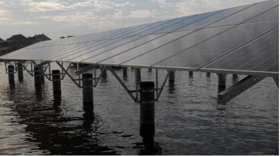 中海阳目前正在建设的中节能嘉兴30MWp项目是浙江省实施“五水共治”(治污水、防洪水、排涝水、保供水、抓节水)水环境治理光伏发电综合示范项目,电站地处运河支流,水深数米,水抽干了再建完全不可能,打桩、安装、土建、布线,都要在船上进行,可以说该电站首开在运河支流建电站的先河,丰富了特色电站的一大重要品类。