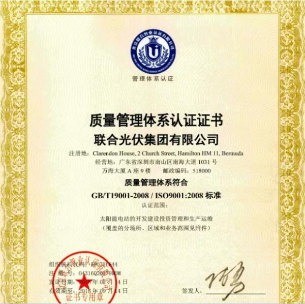 联合光伏表示,通过三体系的建立,完善了本公司的管理体系,规范了工作程序,实现了质量、环境、安全管理工作系统化、规范化、标准化。通过体系的有效运行,提高了本公司运营风险管控能力,提升了本公司的质量管理水平,实现了节能减排。通过三体系证书的取得,联合光伏树立了绿色企业形象,降低了环境管控风险,保障了职工健康安全,增强了本公司的市场竞争力,将为实现把公司打造成为“中国能源转型的国家名片”保驾护航。