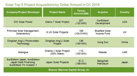 一季度,全球累计完成14起太阳能兼并项目,比去年第四季度多一个。此外,太阳能项目收购达到50起,累计装机容量接近2.4吉瓦,下图是收购金额排在前五的交易: