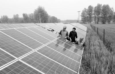 4月14日,临泉县陶老乡陶老行政村前楼自然村光伏电站建设点,工人在检查设备、线路安装情况。临泉县积极落实光伏扶贫工程,目前已受理并验收运行项目28个,并网后每年可为每个贫困家庭增收3000多元。