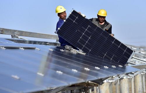 资料图片:工作人员在铺设太阳能板