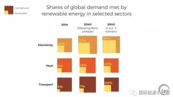 2014年全球交通能耗中只有3%来自可再生能源。如果各国在巴黎协议下的减排承诺得以实现,2040年全球交通能耗中可再生能源占比可达7%;如果要实现温升控制在2摄氏度以内,那么热力供应中可再生能源占比应达20%。