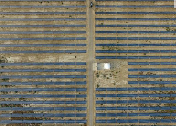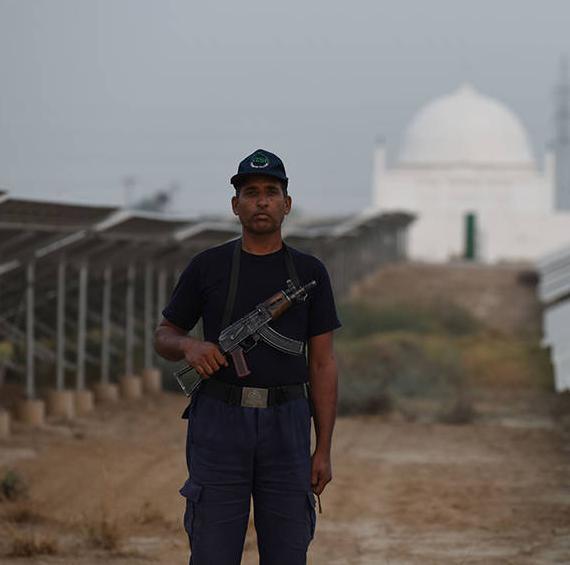 该项目位于以巴基斯坦国父的名字命名的工业园——真纳工业园,这片区域原本属于国有土地,所以搬迁移民方面并没有什么困难,当地村民提出的唯一要求就是能否保留清真寺。图为航拍中的光伏发电站,白色的清真寺坐落于蓝色的光伏电板里。