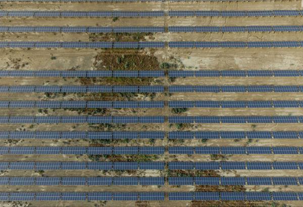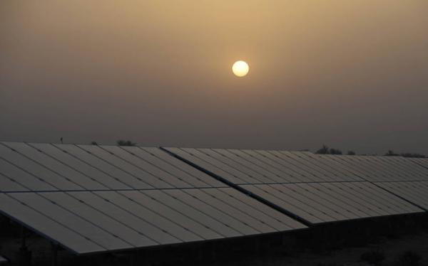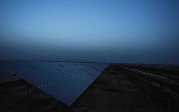 现场施工负责人徐鸿昌称,当地的天气气温非常高,夏季空气温度一个是在45度到50度之间,地表温度能达到68度,人在呼吸的时候,可能吸到鼻孔的热气都非常炙烤,非常难受。所以在国内,我们工人一般能够一天工作八小时没问题,在这只能工作四个小时,大家都是尽力抢一早一晚这两个极端时间去工作。图为日出后的太阳能电板,太阳升起后,电板就可以开始发电。