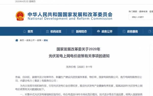 4月2日,国家发改委官网发布《关于2020年光伏发电上网电价政策有关事项的通知》,公布了2020年光伏发电上网电价政策。