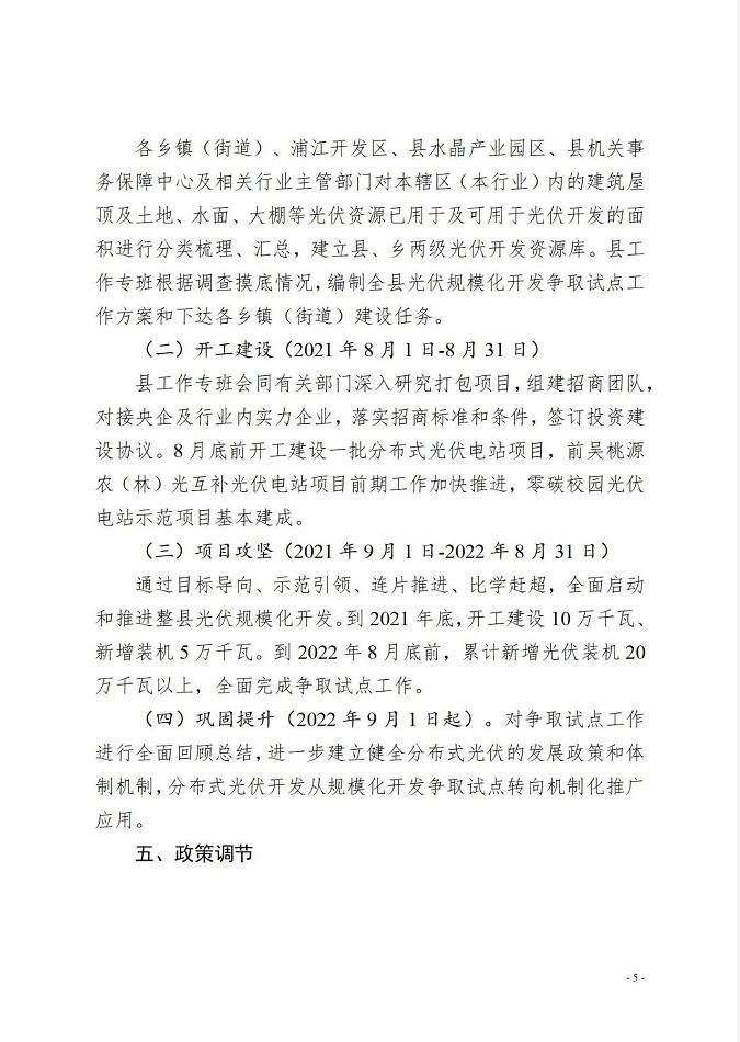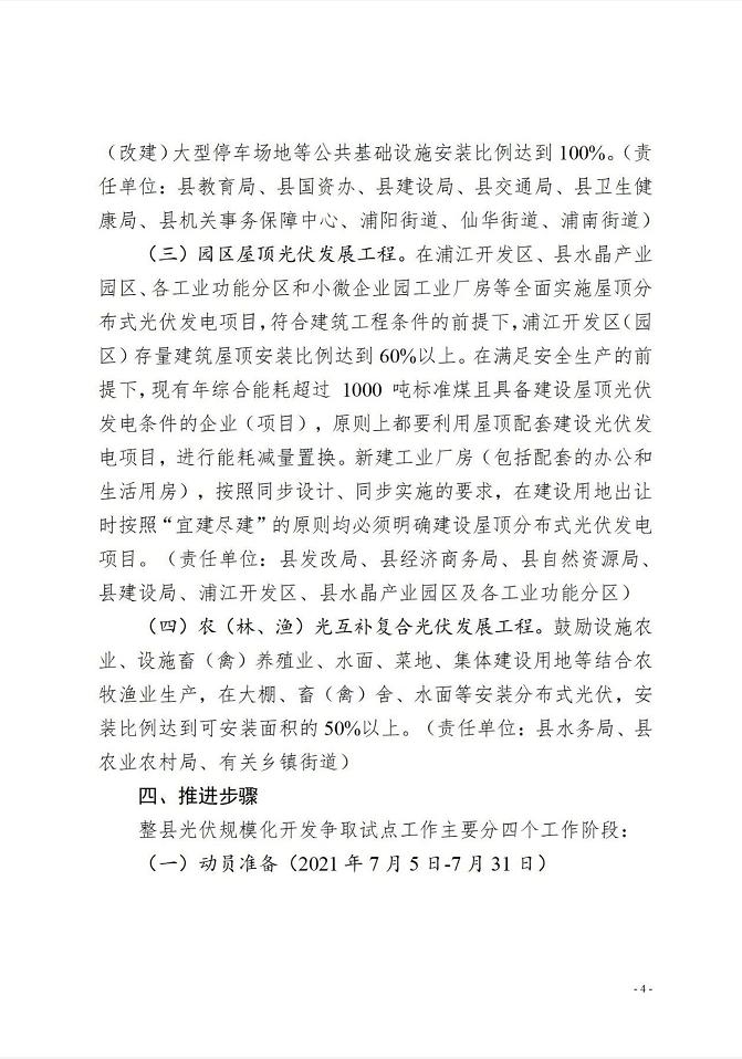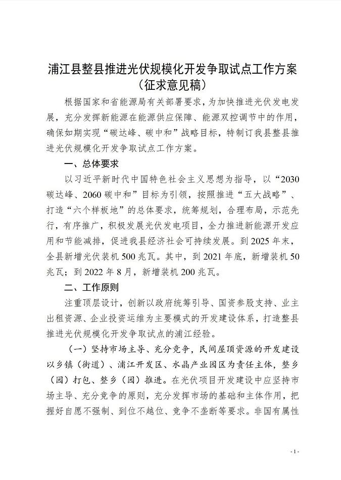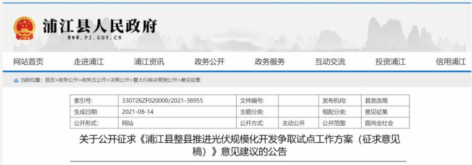 8月14日,浙江省浦江县再次发布关于公开征求《浦江县整县推进光伏规模化开发争取试点工作方案(征求意见稿)》意见建议的公告,这一版意见稿是在此前7月29日发布的一版上进行了修改。该版意见反馈截止时间为2021年9月14日。