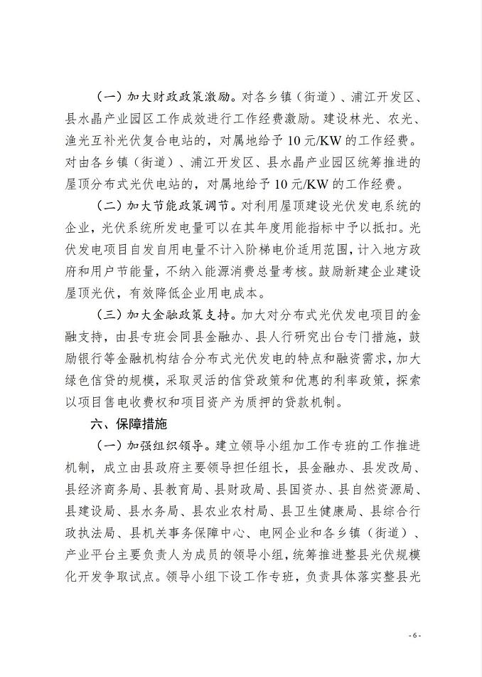 对由各乡镇(街道)、浦江开发区、县水晶产业园区统筹推进的屋顶分布式光伏电站,依然保持不变,给予10元/KW的工作经费。
