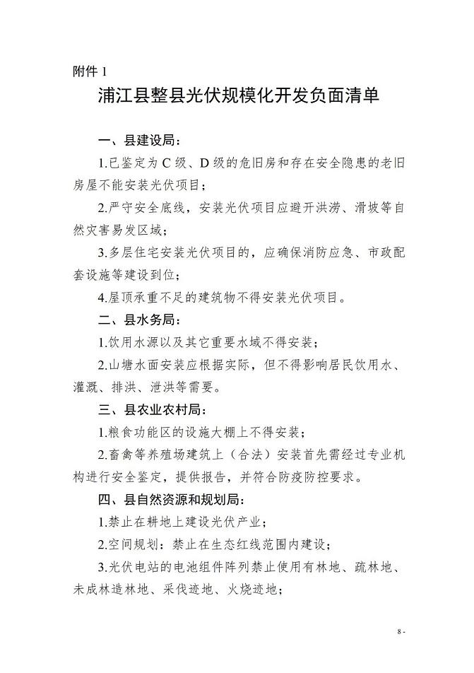 根据光伏們查询,这一版中,浙江浦江县主要删去了“每引进固定资产投资3亿元的制造业投资项目,换取10万KW(左右)的光伏开发资源,在光伏行业内有较大影响力或由产业投资商自行换取开发光伏资源的,可适当降低项目投资标准并同比例降低光伏资源配置”等要求,并改为“县级光伏开发资源库向所有潜在的投资运营商公开,投资商遴选办法另行制订实施细则。鼓励县属国有企业参股支持光伏资源开发运营”。