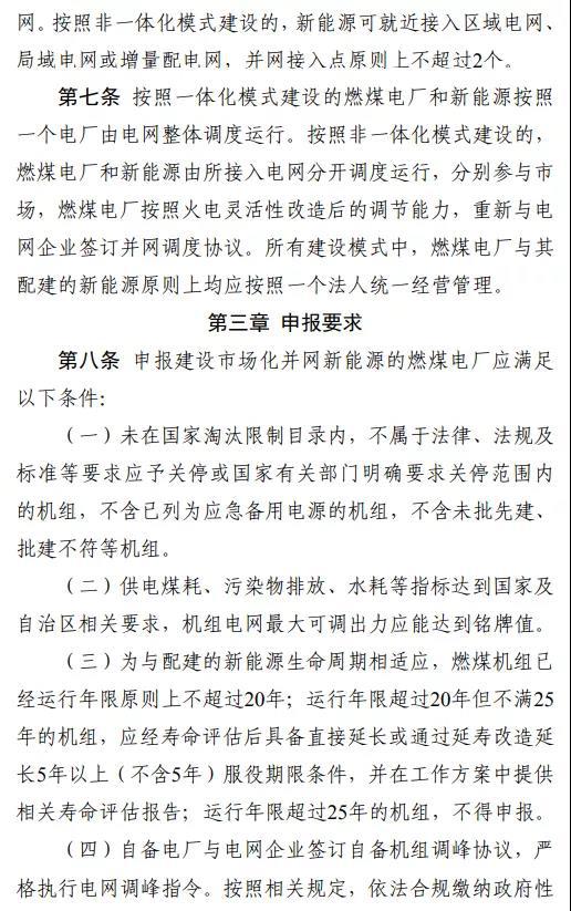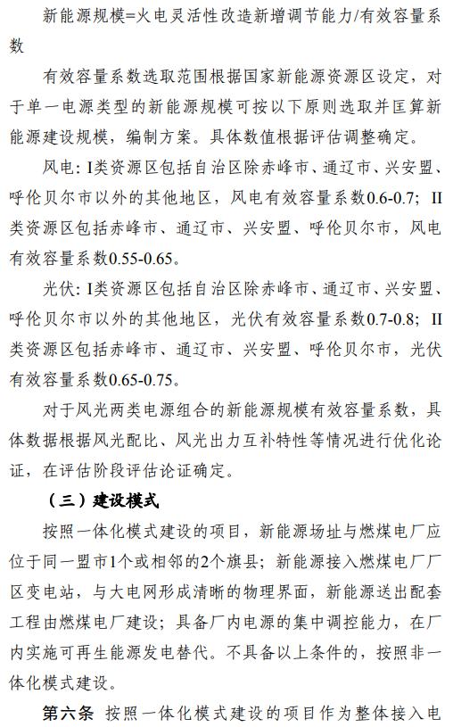另外,建设模式按照一体化模式建设的项目,新能源场址与燃煤电厂应位于同一盟市1个或相邻的2个旗县;新能源接入燃煤电厂厂区变电站,与大电网形成清晰的物理界面,新能源送出配套工程由燃煤电厂建设;具备厂内电源的集中调控能力,在厂内实施可再生能源发电替代。不具备以上条件的,按照非一体化模式建设。