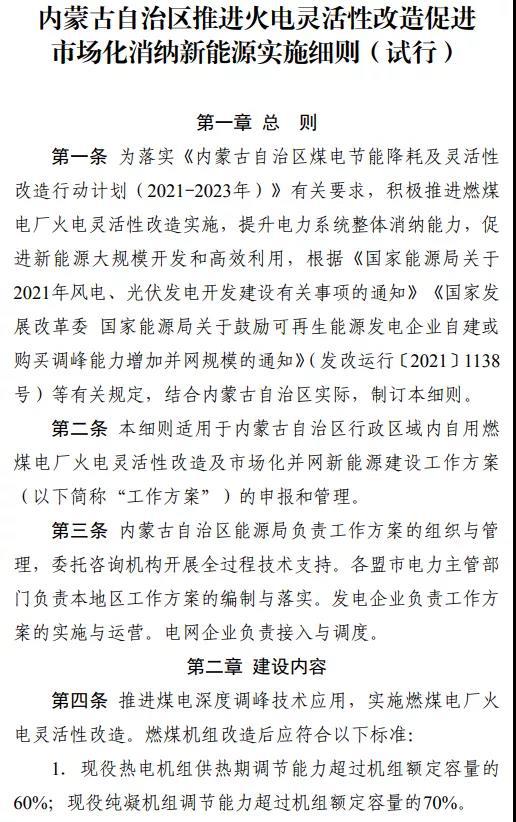 为积极推进燃煤电厂火电灵活性改造实施,提升电力系统整体消纳能力,促进新能源大规模开发和高效利用,8月26日,内蒙古自治区能源局发布关于《内蒙古自治区推进火电灵活性改造促进市场化消纳新能源实施细则(试行)》的通知。