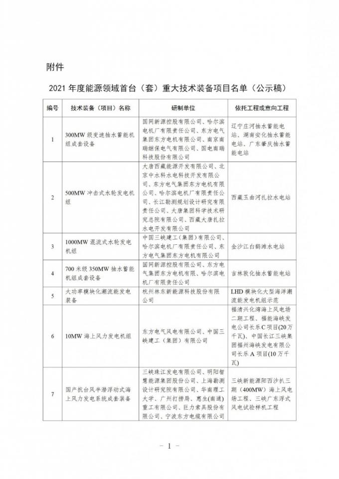 根据《国家能源局关于促进能源领域首台(套)重大技术装备示范应用的通知》(国能发科技〔2018〕49号)、《能源领域首台(套)重大技术装备评定和评价办法(试行)》(国能发科技〔2019〕89号)等有关要求,经组织专家评审和复核,我局拟将“300MW级变速抽水蓄能机组成套设备”等76项技术装备列入2021年度能源领域首台(套)重大技术装备项目清单(具体名单见附件),现予以公示。