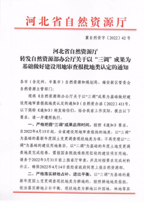近期,河北省自然资源厅转发自然资源部办公厅关于以“三调”成果为基础做好建设用地审查报批地类认定的通知,按照《通知》要求,自2022年4月15日起,全省建设用地审查报批的地类,以“三调”为基础的最新年度国土变更调查现状地类为准,不再受理以“二调”为基础的建设用地卷宗。