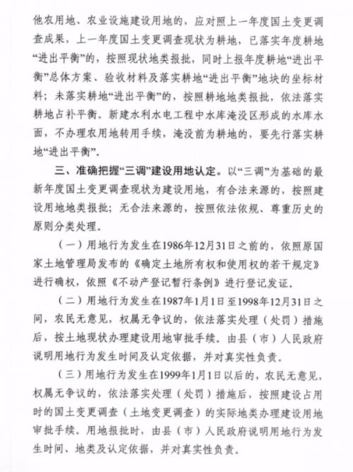 3月9日,自然资源部办公厅印发《关于以"三调"成果为基础做好建设用地审查报批地类认定的通知》,自4月15日起实施。《通知》明确了建设用地审查报批时地类认定规则。对报批时现状为建设用地的,应根据其来源合法性进行分类处理。有合法来源的,按照建设用地地类报批;无合法来源的,按照建设占用时的国土变更调查(土地变更调查)的实际地类报批,地类为耕地的,应依法落实耕地占补平衡。