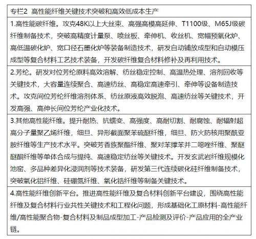 (二)提升高性能纤维生产应用水平。提高碳纤维、芳纶、超高分子量聚乙烯纤维、聚酰亚胺纤维、聚苯硫醚纤维、聚四氟乙烯纤维、连续玄武岩纤维的生产与应用水平,提升高性能纤维质量一致性和批次稳定性。进一步扩大高性能纤维在航空航天、风力和光伏发电、海洋工程、环境保护、安全防护、土工建筑、交通运输等领域应用。